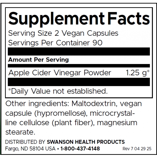 Ябълковият оцет е класическо домашно лекарство, което се произвежда от ферментирали ябълки. Интересът към този натурален продукт се обяснява с това, че ябълковият оцет е богат на витамини и минерали и има способността да подпомага прочистването и детоксикацията на тялото, както и регулирането на теглото. Тъй като за много хора вкусът на ябълковия оцет не е приятен, Суонсън разработи чудесна негова алтернатива под формата на хранителна добавка. Нашите капсули доставят всички полезни вещества, съдържащи се в ябълковия оцет. Всяка капсула осигурява 625 mg ябълков оцет, за да се възползвате от неговите предимства по всякакъв повод и независимо от обстоятелствата.