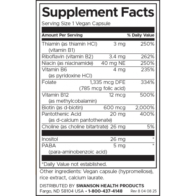 Дневният В-комплекс на Суонсън осигурява мощни количества от осем различни витамина от група B заедно с холин, инозитол и PABA в икономични веге капсули, които можете да приемате всеки ден, без да натоварвате бюджета си. Това е чудесен и достъпен начин да си набавите хранителните вещества от група B, от които се нуждаете, за да се справяте със стреса всеки ден.