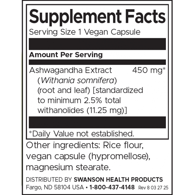 | Екстракт от Ашваганда (Withania somnifera) (корени) [стандартизиран до минимум 2,5% общо витанолиди (11,25 mg)] | 450 мг | 1350 мг |