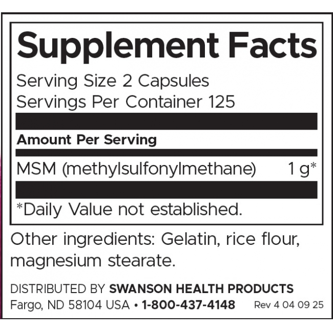 Подкрепете здравето на ставите си още днес с МСМ на Суонсън! Тази уникална добавка доставя биологично активна форма на основния минерал сяра и е отговорна за осигуряването на основното подхранване на тъканите и мобилността на ставите. МСМ също така е отлично средство за поддържане на косата, кожата и ноктите.