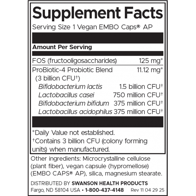 Пробиотик-4 на Суонсън е пробиотична добавка с широк спектър на действие, която ще достави на организма ви 3 милиарда жизнеспособни организми от четири избрани щама полезни бактерии. Формулата съдържа Bifidobacterium Lactis, Lactobacillus casei, Lactobacillus ацидофилус и Bifidobacterium bifidum. Всичко това е събрано във веге капсули, подходящи за прием от вегетарианци.